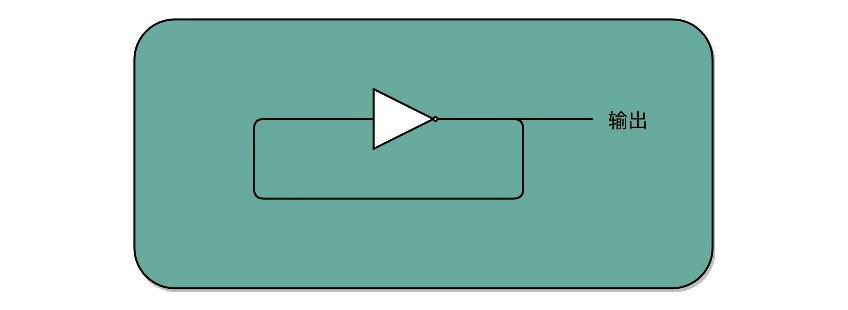 开关A一开始断开,B一开始合上,当A接通时线圈产生磁性,合上的开关B就会被吸到线圈而断开,于是整个电路断开,电路断开导致电磁线圈不产生磁场,那么开关B又回去合上,再次接通电路,如此循环。这样就相当于不断有0和1的信号产生,电路的输出信号又成为电路的输入信号,这种电路叫反馈电路(Feedback Circuit)。这样的一个反馈电路,可以用一个输出结果接回输入的反相器(Inverter),即非门,如下所示:
