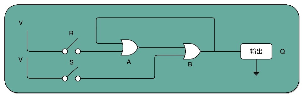 (1)在这个电路一开始,输入开关都是关闭的,所以或非门(NOR)A的输入是0和0,所以输出就是 1。而或非门B的输入是0和A的输出1,对应输出就是0。B的输出0反馈到A,和之前的输入没有变化,A的输出仍然是1。而整个电路的输出Q,也就是0。