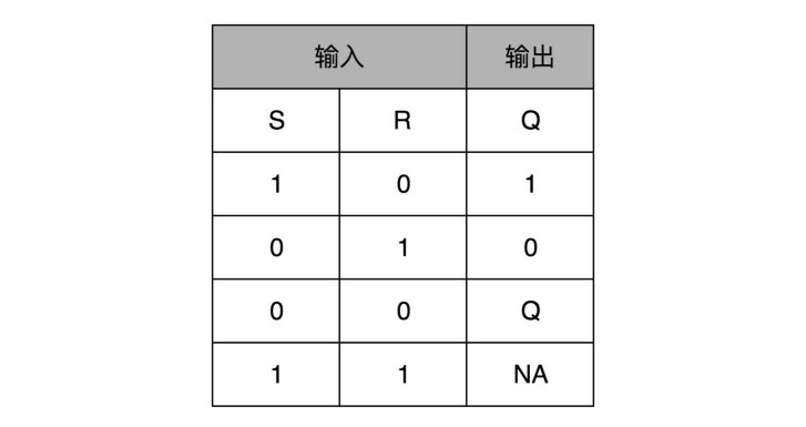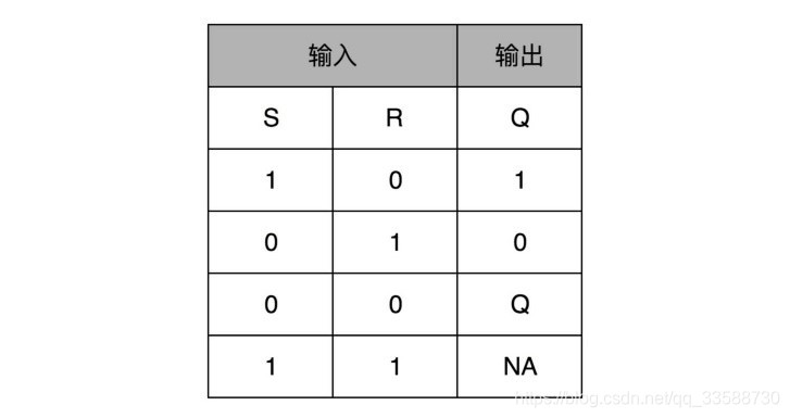 这里的这个电路是最简单的RS触发器,也就是所谓的复位置位触发器(Reset-Set Flip Flop) 。对应的输出结果的真值表如下所示,可以看到,当两个开关都是0的时候,对应的输出不是1或者0,而是和Q的上一个状态一致:
