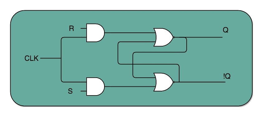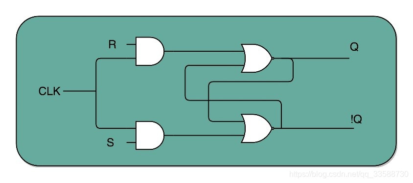 在R和S开关之后,加入了两个与门,同时给这两个与门加入了一个时钟信号CLK作为电路输入。这样,当CLK在低电平时,与门的输入里有一个0,R和S后的2个与门的输出必然是0。也就是说,无论怎么按R和S的开关,对应的Q的输出都不会发生变化。只有CLK在高电平的时候,与门的一个输入是1,输出结果完全取决于R和S的开关,此时可以通过开关R和S,来决定对应Q的输出。