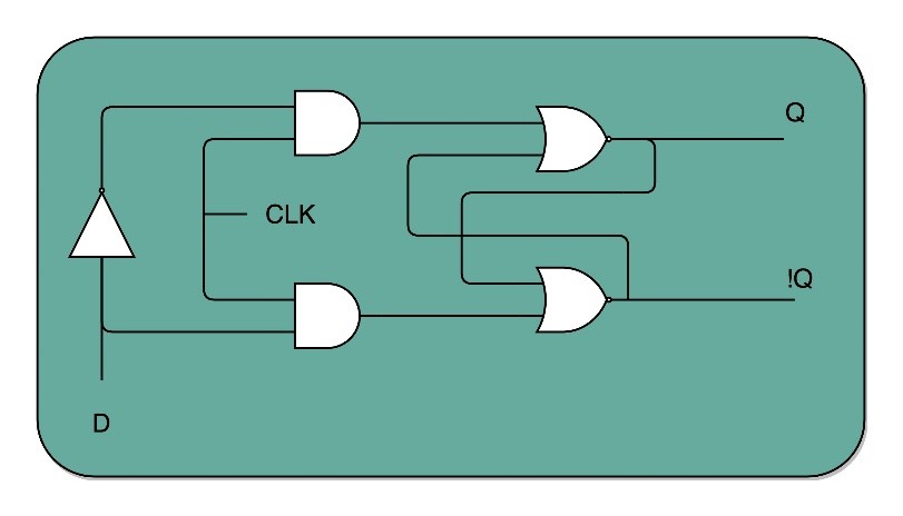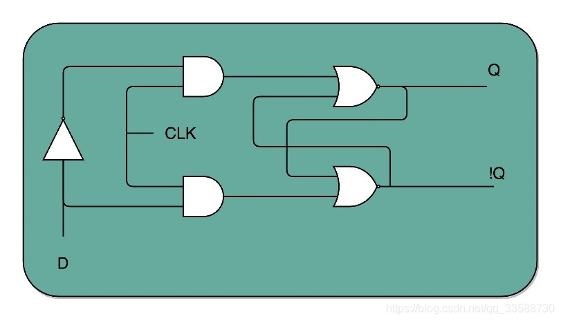 此时,如果让R和S的开关,也用一个反相器连起来,也就是通过同一个开关D(data的意思)控制R和S。只要CLK信号是1,R和S就可以设置输出Q。而当CLK信号是0时,无论R和S怎么设置,输出信号Q是不变的。这样,这个电路就成了最常用的D型触发器,如下所示: