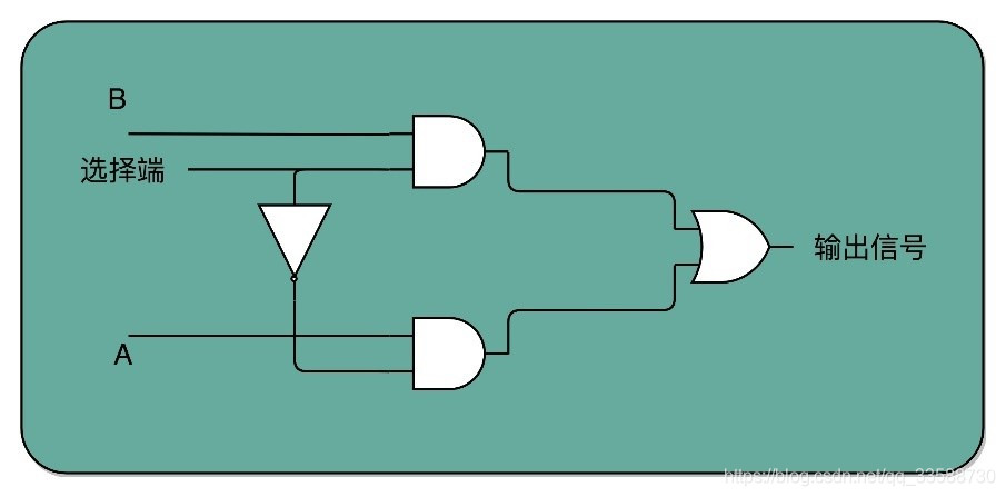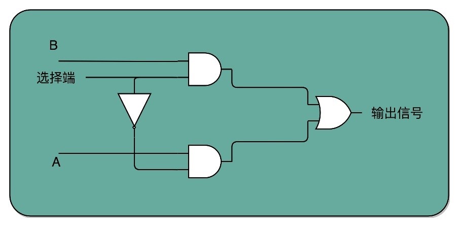 如果把“寻址”退化到最简单的情况,就是在两个地址中,去选择一个地址。这样的电路,叫2-1选择器。通过一个反相器、两个与门和一个或门,就可以实现一个2-1选择器。通过控制反相器的输入是0还是1,能够决定对应的输出信号,是和地址A,还是地址B的输入信号一致,如下所示: