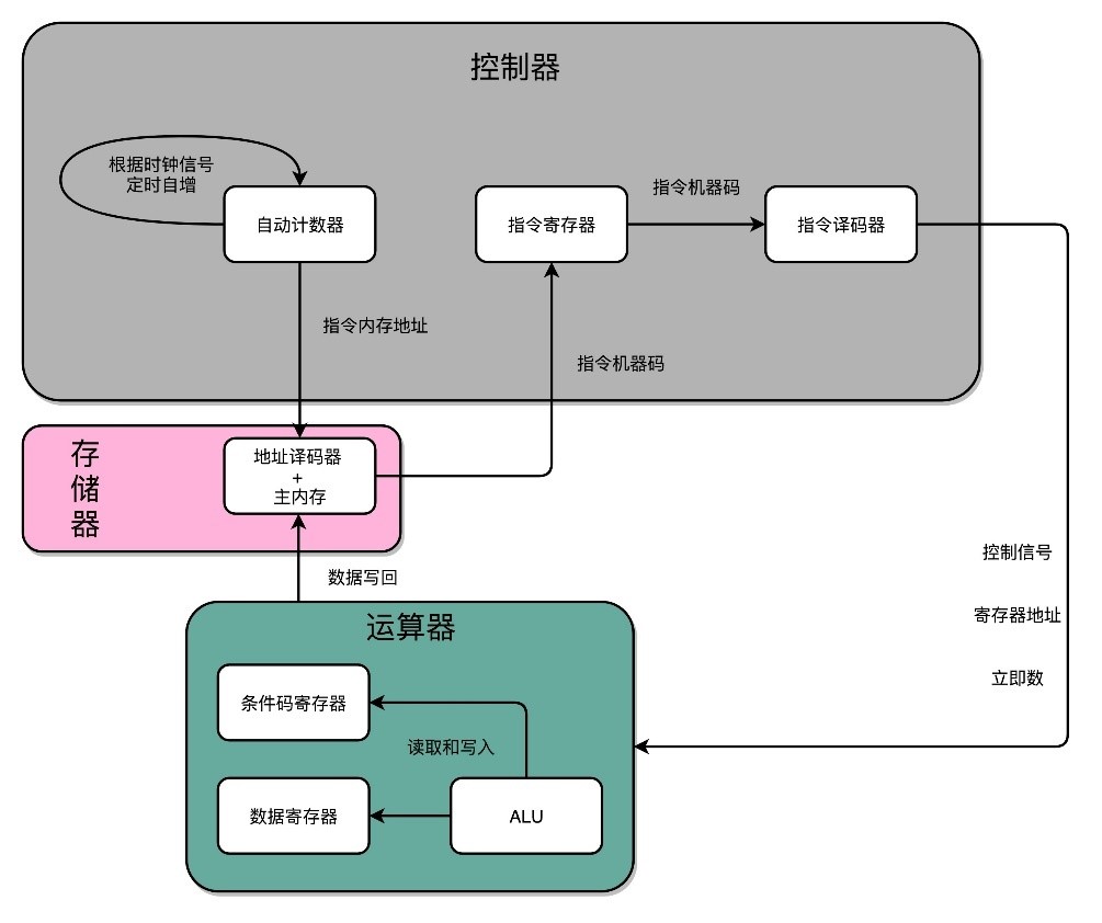 运算器里的ALU和各种组合逻辑电路,可以认为是一个固定功能的电路。控制器“翻译”出来的,就是不同的控制信号。这些控制信号,告诉ALU去做不同的计算。可以说正是控制器的存在,使我们可以“编程”来实现功能,如下所示: