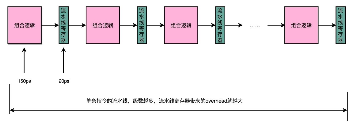 因此,为了避免同一个时刻只执行一条指令顺序等待造成CPU性能浪费,通过把指令的执行过程切分成一个个流水线级,来提升CPU的吞吐率。而本身的CPU设计,又是由一个个独立的组合逻辑电路串接起来形成的,天然能够适合这样采用流水线“专业分工”的工作方式。由于每一级的overhead,所以一味地增加流水线深度,并不能无限地提高性能。同样地,因为指令的执行不再是顺序地一条条执行,而是在上一条执行到一半的时候,下一条就已经启动了,所以也给程序步骤执行的调度设计带来了很多挑战。