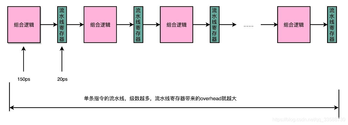 14. 流水线提升了CPU同时执行多条指令的吞吐率,但流水线级数不能做的过长,因为增加流水线深度是有性能成本的。用来同步时钟周期的单位不再是指令级别的,而是流水线阶段级别的。每一级流水线对应的输出,都要放到流水线寄存器(Pipeline Register)里面,然后在下一个时钟周期,交给下一个流水线级去处理。所以,每增加一级的流水线,就要多一级写入到流水线寄存器的操作。虽然流水线寄存器非常快,比如只有20皮秒(即10^(−12)秒),如下所示: