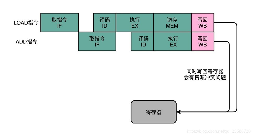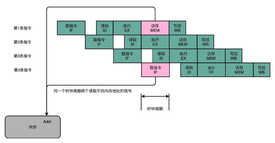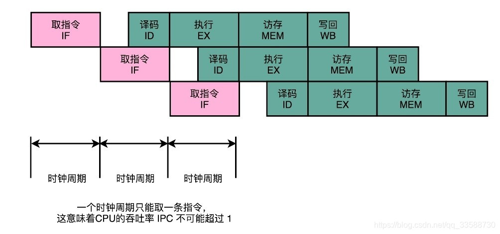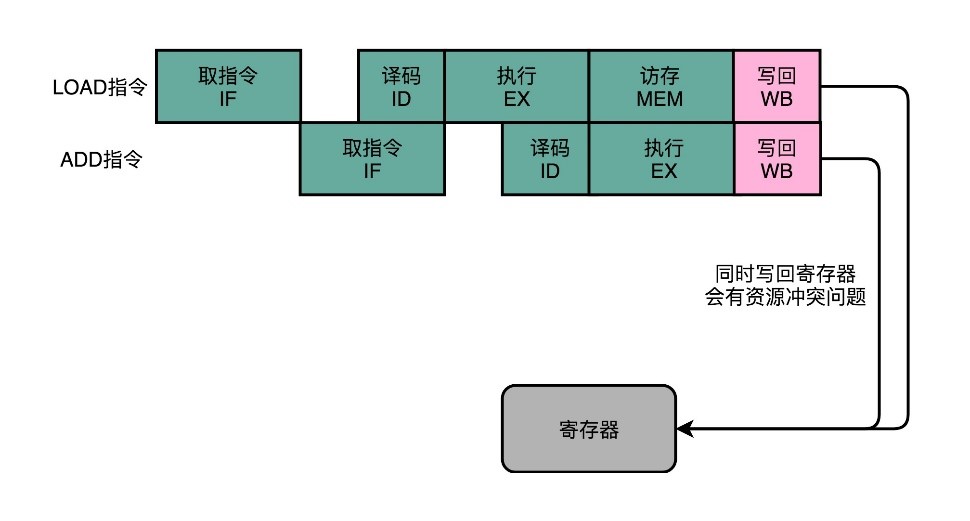 在最简单的情况下,需要让每一条指令,从程序计数,到获取指令、执行指令,都在一个时钟周期内完成。但是如果PC寄存器自增地太快,程序就会出错。因为前一次的运算结果还没有写回到对应的寄存器里面的时候,后面一条指令已经开始读取里面的数据来做下一次计算了。这个时候,如果指令使用同样的寄存器,前一条指令的计算就会没有效果,计算结果就错了。