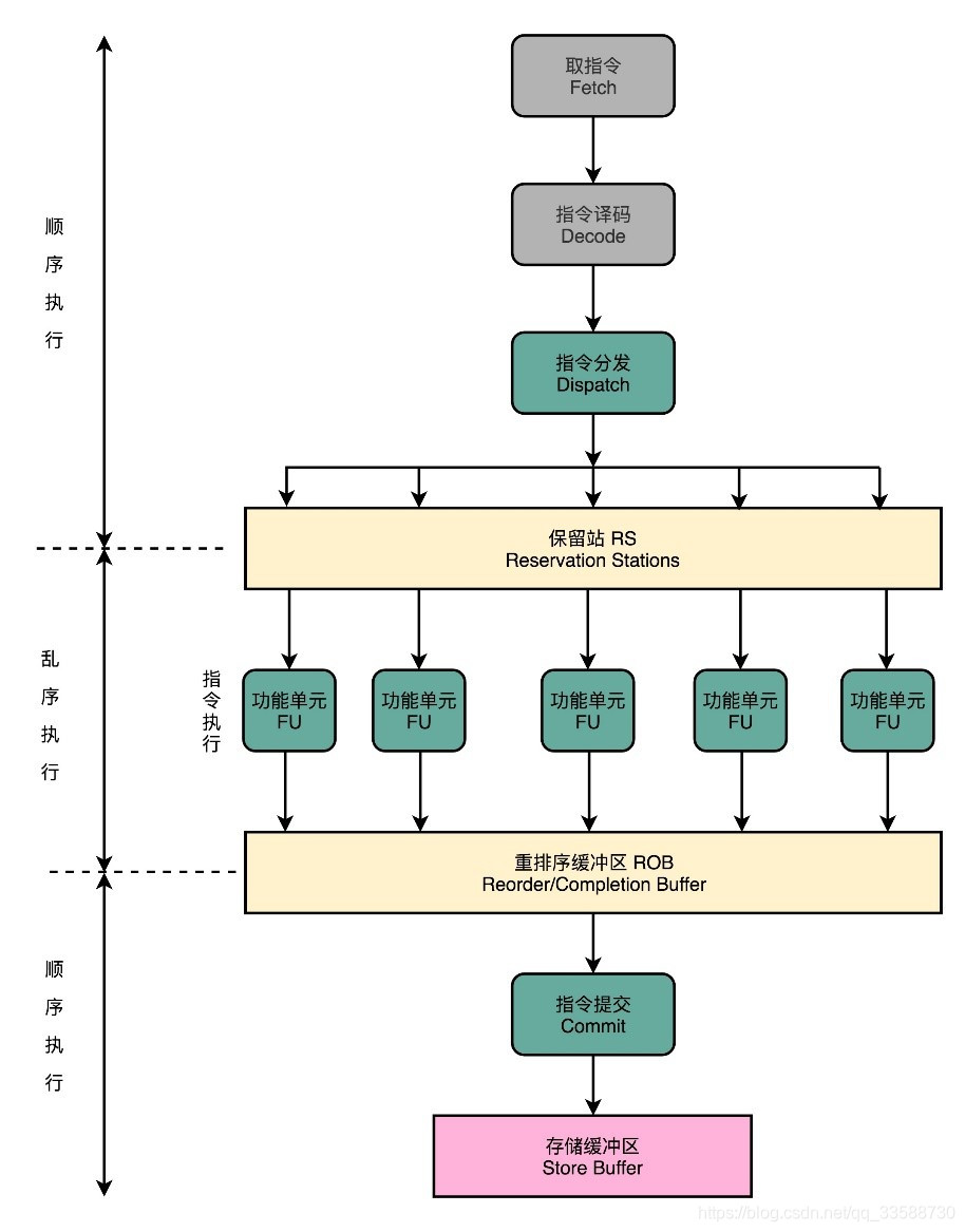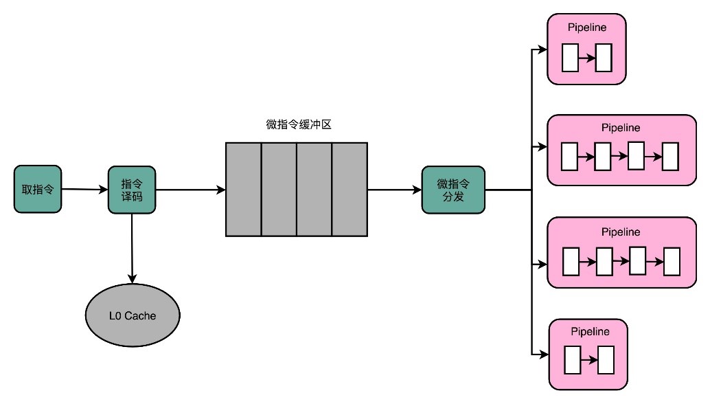 在微指令架构的CPU里面,编译器编译出来的机器码和汇编代码并没有发生什么变化。但在指令译码的阶段,指令译码器“翻译”出来的,不再是某一条 CPU 指令,译码器会把一条机器码“翻译”成好几条“微指令”。这里的一条条微指令,就不再是CISC风格的了,而是变成了固定长度的RISC风格的了。这些 RISC风格的微指令,会被放到一个微指令缓冲区里面,然后再从缓冲区里面,分发给到后面的超标量,并且是乱序执行的流水线架构里面。不过这个流水线架构里面接受的,就不是复杂的指令,而是精简的指令了。在这个架构里,指令译码器相当于变成了设计模式里的一个“适配器”(Adaptor)。这个适配器,填平了CISC和RISC之间的指令差异。