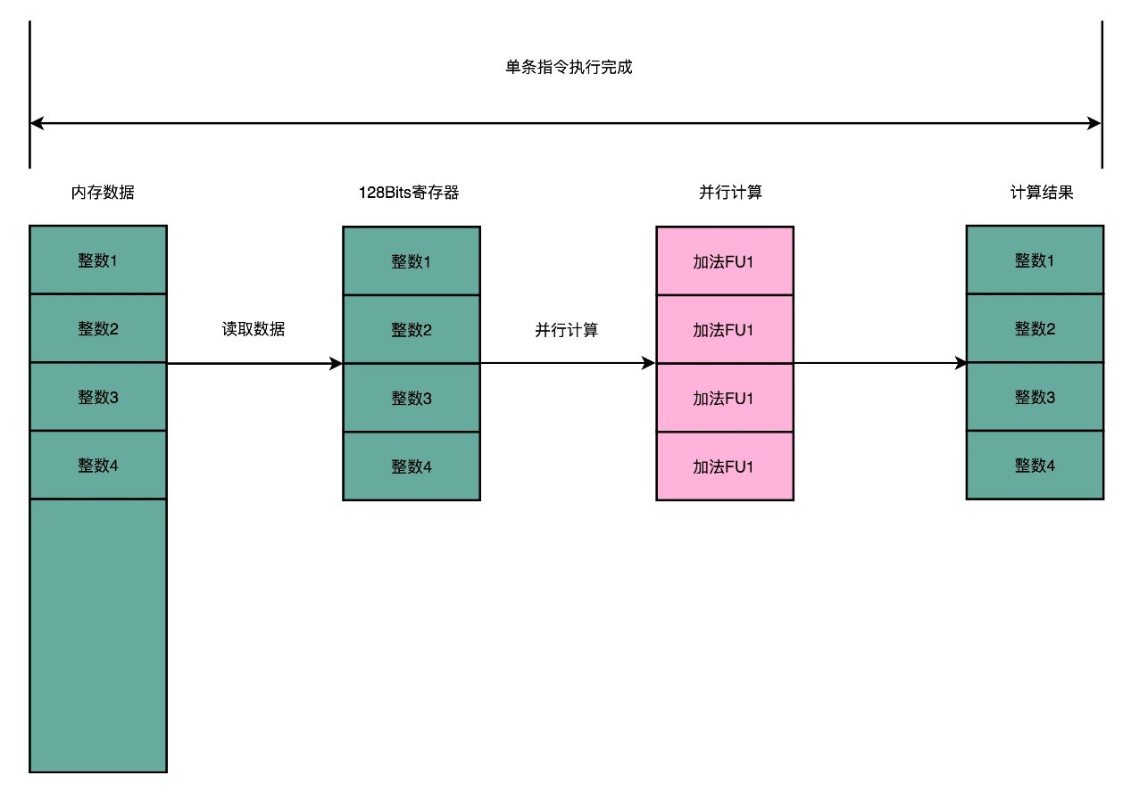 而前面使用循环来一步一步计算的算法被称为SISD,也就是单指令单数据(Single Instruction Single Data)的处理方式。如果是一个多核CPU,那么它同时处理多个指令的方式叫MIMD即多指令多数据(Multiple Instruction Multiple Data)。SIMD指令能快那么多是因为,SIMD在获取数据和执行指令的时候,都做到了并行。
