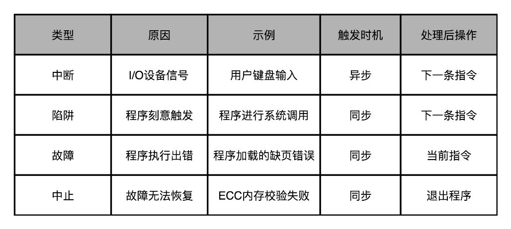 (4)中止(Abort)。与其说这是一种异常类型,不如说这是故障的一种特殊情况。当CPU遇到了故障,但是恢复不过来的时候,程序就不得不中止了。四种异常的概要如下所示: