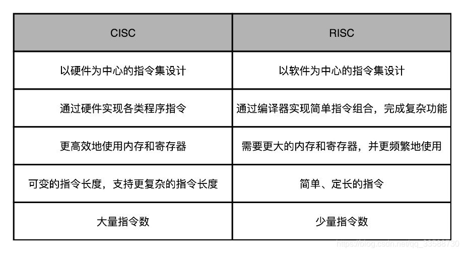 34. 历史上曾经出现过CISC与RISC的CPU架构之争。对于“程序的CPU执行时间 = 指令数 × CPI × Clock Cycle Time”这个公式,CISC为了尽可能节省内存消耗,复杂指令都在硬件层面实现,存放大量复杂指令集,将复杂计算合成1个指令,其实就是通过优化指令数,来减少CPU的执行时间。而RISC的架构只存放最常用的简单指令,复杂指令在软件层面通过多个简单指令组合完成,CPU内空出来的复杂指令晶体管空间存放更多通用寄存器,也消耗更多内存,其实是在优化 CPI,因为RISC指令比较简单,需要的时钟周期就比较少。两者的比较如下所示: