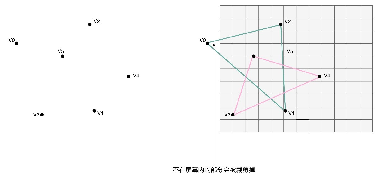 (2)图元处理(Primitive Processing)。其实就是要把顶点处理完成之后的各个顶点连起来,变成多边形。其实转化后的顶点,仍然是在一个三维空间里,只是第三维的Z轴,是正对屏幕的“深度”。所以针对这些多边形,需要做一个操作,叫剔除和裁剪(Cull and Clip),也就是把不在屏幕里面,或者一部分不在屏幕里面的内容给去掉,减少接下来流程的工作量。