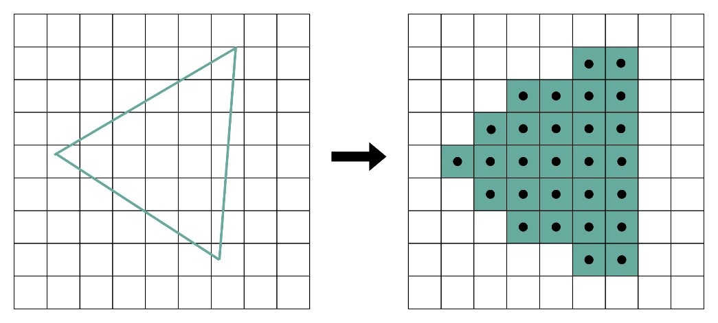 (3)栅格化(Rasterization)。屏幕分辨率是有限的。它一般是通过一个个“像素(Pixel)”来显示出内容的。所以,对于做完图元处理的多边形,要把它们转换成屏幕里面的一个个像素点。这个栅格化操作,有一个特点和上面的顶点处理是一样的,就是每一个图元都可以并行独立地栅格化。