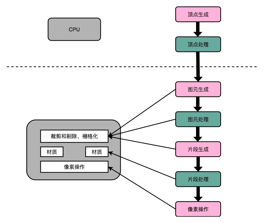 这些固定步骤的大量运算,如果全交给CPU完成会耗尽CPU的主频性能。既然图形渲染的流程是固定的,那直接用硬件来处理这部分过程,不用CPU来计算就好了,因此显卡诞生。显然,它不需要考虑CPU那样流水线停顿、乱序执行等各类导致CPU计算变得复杂的问题,也不需要有什么可编程能力,只要让硬件按照写好的固定逻辑步骤进行大量运算就好了,早期显卡还没有分担顶点处理的功能,这一步过去依然由CPU完成,如下所示: