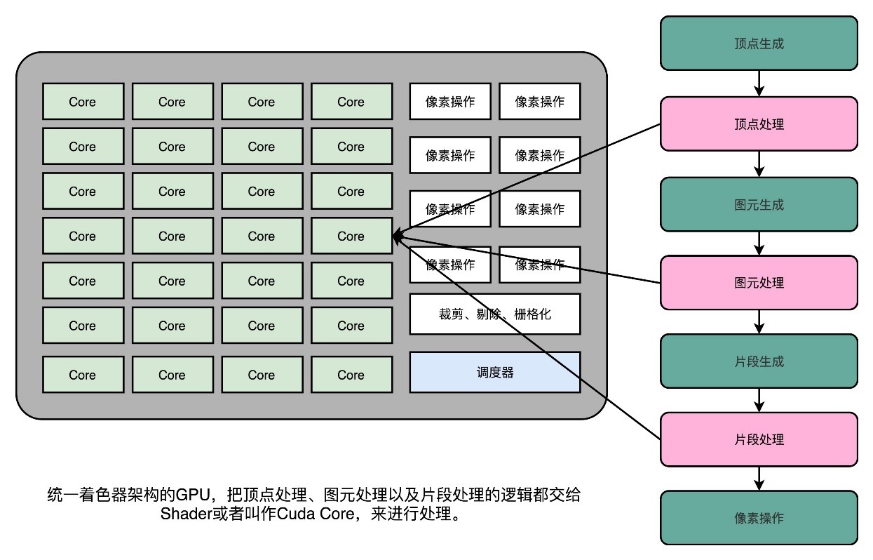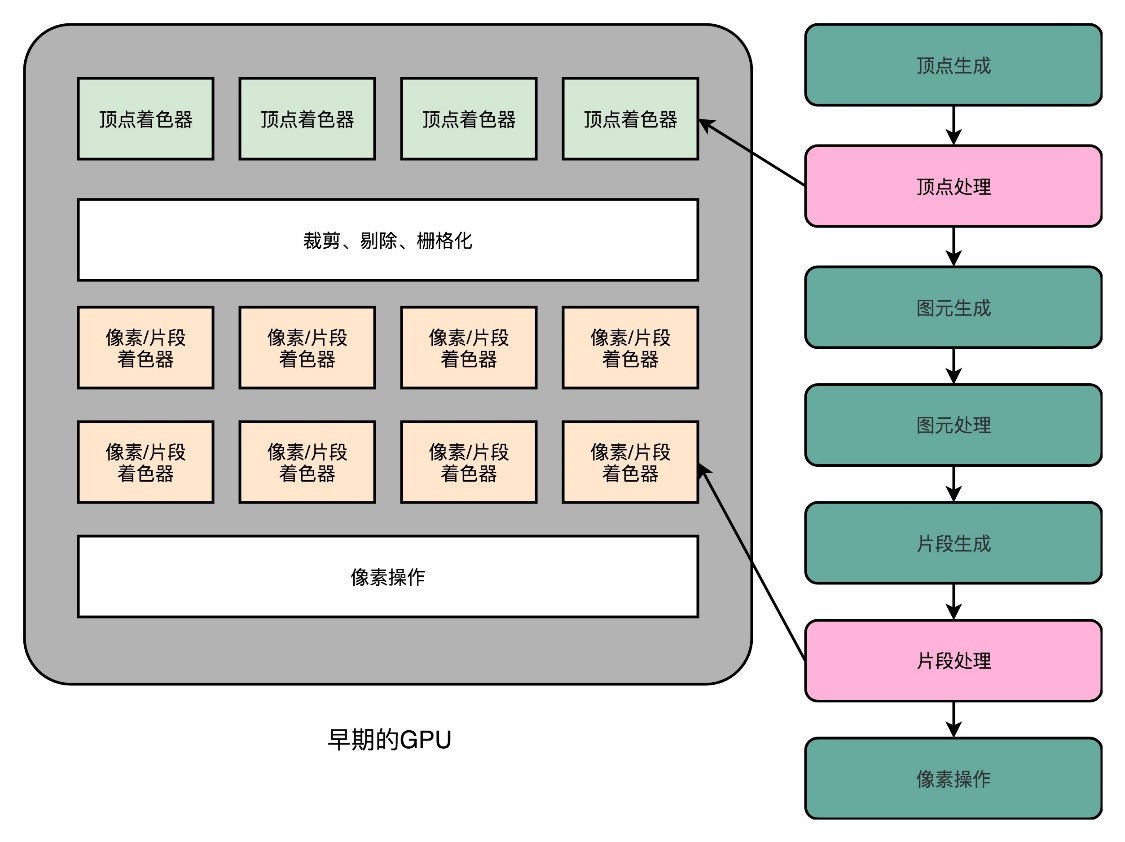 这个时候的GPU有两类Shader,也就是Vertex Shader和Fragment Shader。在进行顶点处理的时候,操作的是多边形的顶点;在片段操作的时候,操作的是屏幕上的像素点。对于顶点的操作,通常比片段要复杂一些。所以一开始,这两类Shader都是独立的硬件电路,也各自有独立的编程接口。因为这么做,硬件设计起来更加简单,一块GPU上也能容纳下更多的Shader。