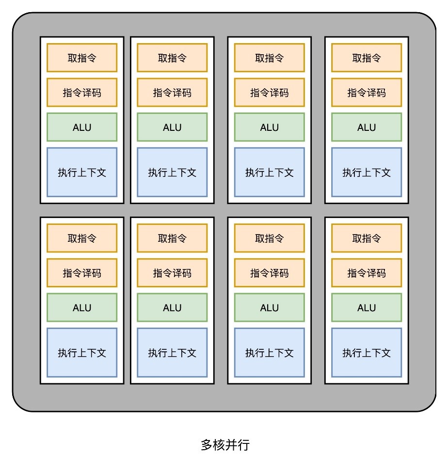 这样一来GPU电路就比CPU简单很多了。于是就可以在一个GPU里面,塞很多个并行的GPU电路来实现计算,就好像多核CPU一样。和CPU不同的是,GPU不需要单独去实现多线程的计算。因为GPU的运算是天然并行的,如下所示: