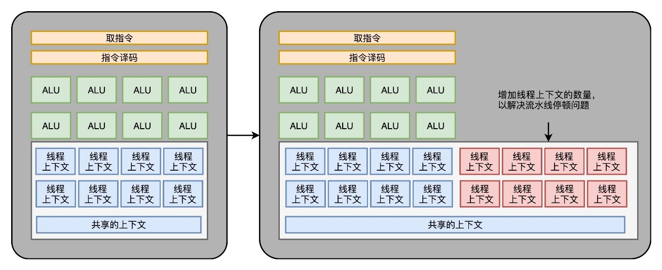 38. 虽然GPU里面主要以数值计算为主,不过既然已经是一个“通用计算”的架构了,GPU里面也避免不了会有 if…else 这样的条件分支。但是,GPU里没有CPU这样的分支预测的电路。这些电路在上面“芯片瘦身”的时候就已经被砍掉了。所以,GPU里的指令可能会遇到和CPU类似的“流水线停顿”问题。类似CPU里的超线程技术,在GPU上也可以做类似的事情,也就是遇到停顿的时候,调度一些别的计算任务给当前的ALU。和超线程一样,既然要调度一个不同的任务过来,就需要针对这个任务,提供更多的执行上下文。所以,一个Core里面的执行上下文的数量,需要比ALU多,如下所示: