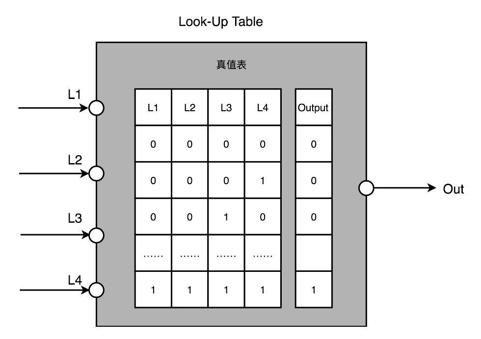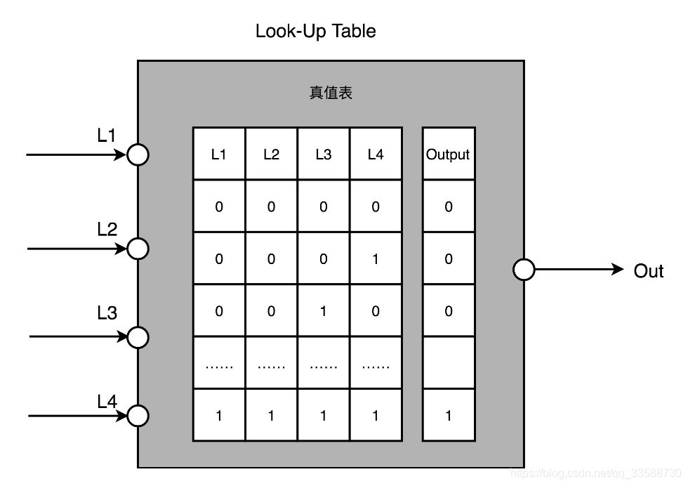(1) 用存储换功能实现组合逻辑。实现CPU的功能的时候需要完成各种各样的电路逻辑,在FPGA里这些基本的电路逻辑,不是采用布线连接的方式进行的,而是预先根据在软件里面设计的逻辑电路,算出对应的真值表,然后直接存到一个叫作 LUT(Look-Up Table,查找表)的电路里面。这个LUT其实就是一块存储空间,里面存储了“特定的输入信号下,对应输出 0 还是 1”,如下所示: