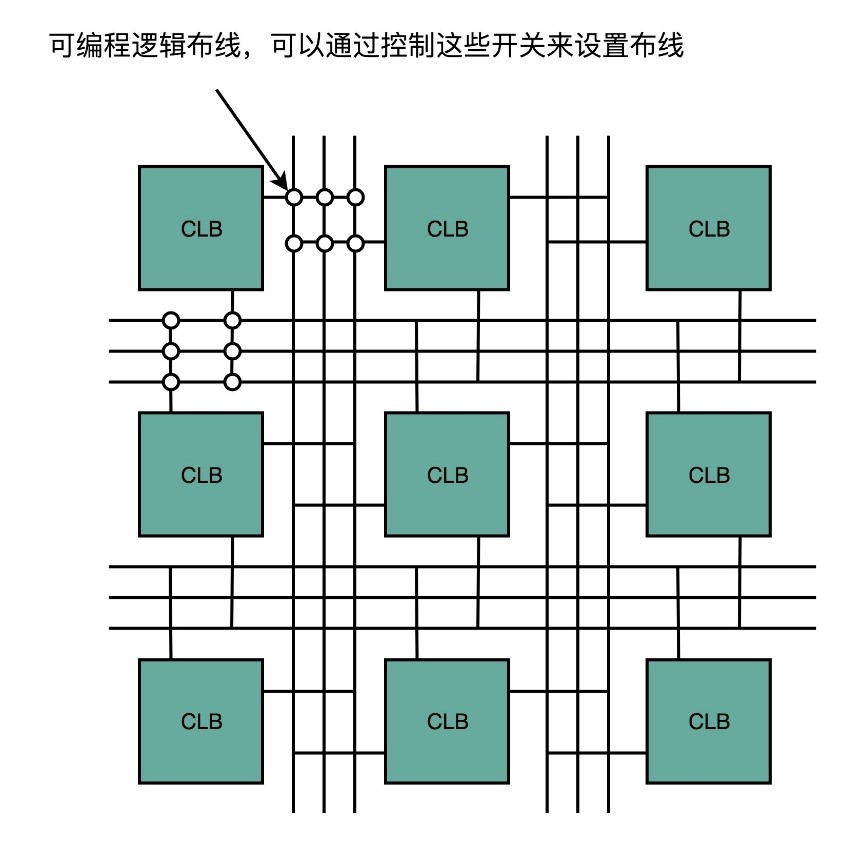 (3)FPGA是通过可编程逻辑布线,来连接各个不同的CLB,最终实现想要实现的芯片功能。这个可编程逻辑布线就像铁路网。整个铁路系统已经铺好了,但是整个铁路网里面,设计了很多个道岔。可以通过控制道岔来确定不同的列车线路。在可编程逻辑布线里面,“编程”在做的就是拨动像道岔一样的各个电路开关,最终实现不同CLB之间的连接,完成想要的芯片功能。