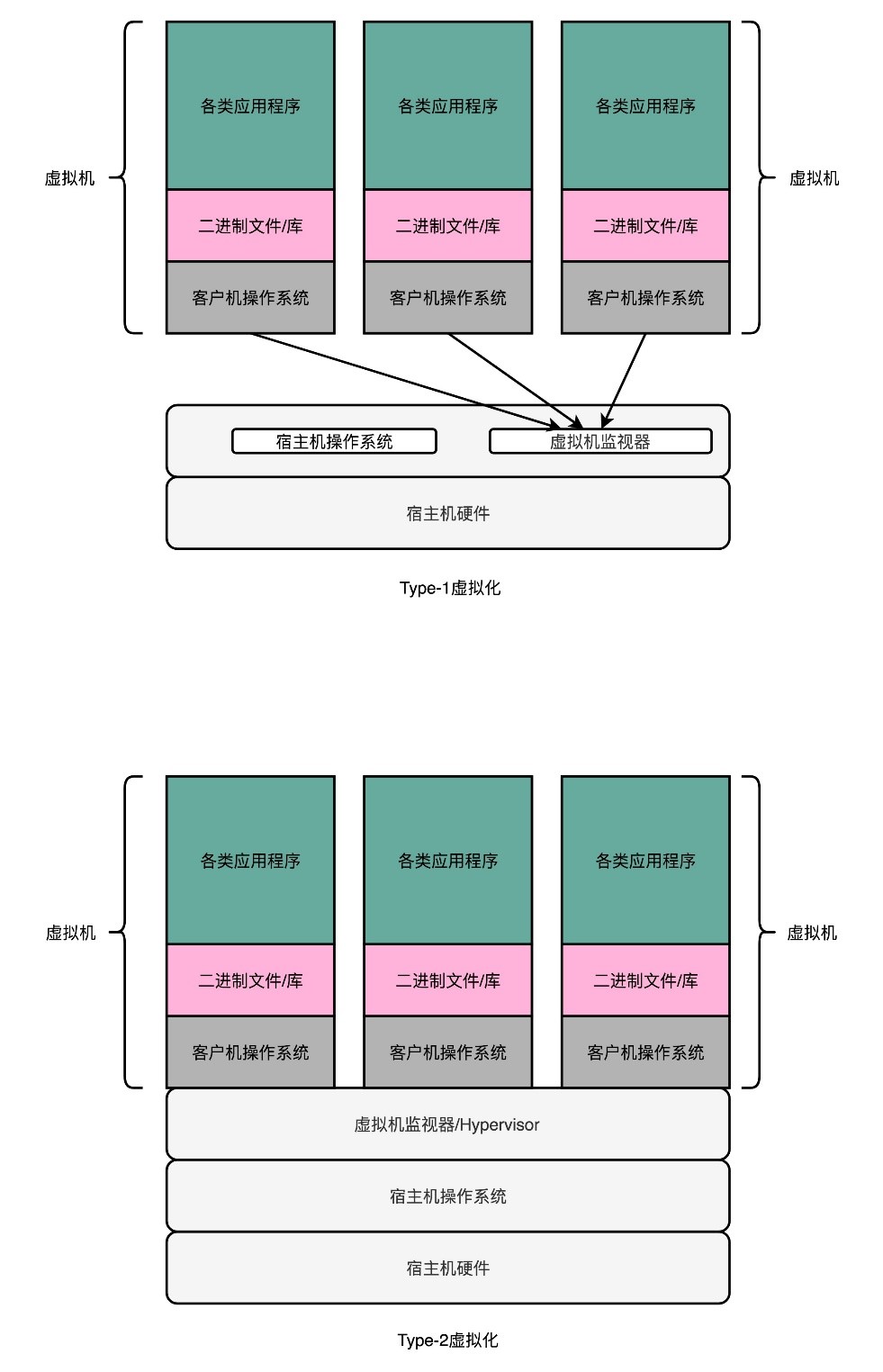 (2)Type-2虚拟机。虚拟机监视器好像一个运行在操作系统上的软件,客户机的操作系统把最终到硬件的所有指令,都发送给虚拟机监视器。而虚拟机监视器又会把这些指令再交给宿主机的操作系统去执行。这和上面的模拟器方式看起来没有太大区别,只是把在模拟器里的指令翻译工作,挪到了虚拟机监视器里。这种方式更多是用在日常的个人电脑里,例如Virtual Box和Vmware Workstation。