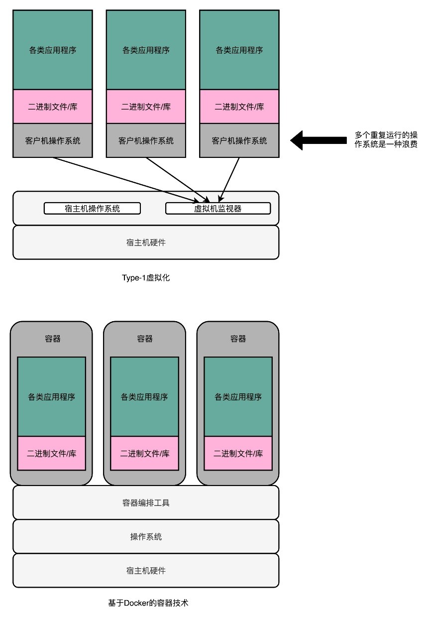 48. 虽然Type-1型虚拟机看起来已经没有太大硬件损耗。但是在实际的物理机上同时运行了多个虚拟机,而这每一个虚拟机都运行了一个属于自己的单独操作系统。多运行一个操作系统,意味着要多消耗一些资源在CPU、内存乃至磁盘空间上。那能否不要多运行的这个操作系统呢?其实是可以的,因为用户想要的未必是一个完整的、独立的、全虚拟化的虚拟机,很多时候想要租用的不是“独立服务器”,而是独立的计算资源。在服务器领域开发的程序都是跑在Linux上的,其实并不需要一个独立的操作系统,只要一个能够进行资源和环境隔离的“独立空间”就好了。