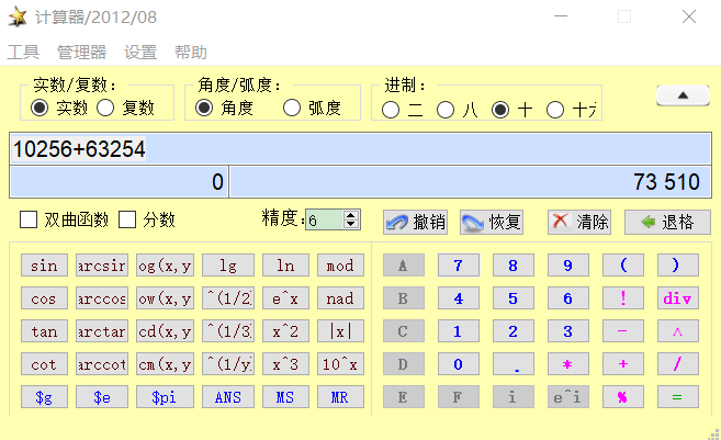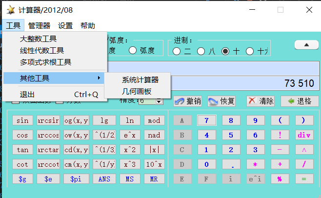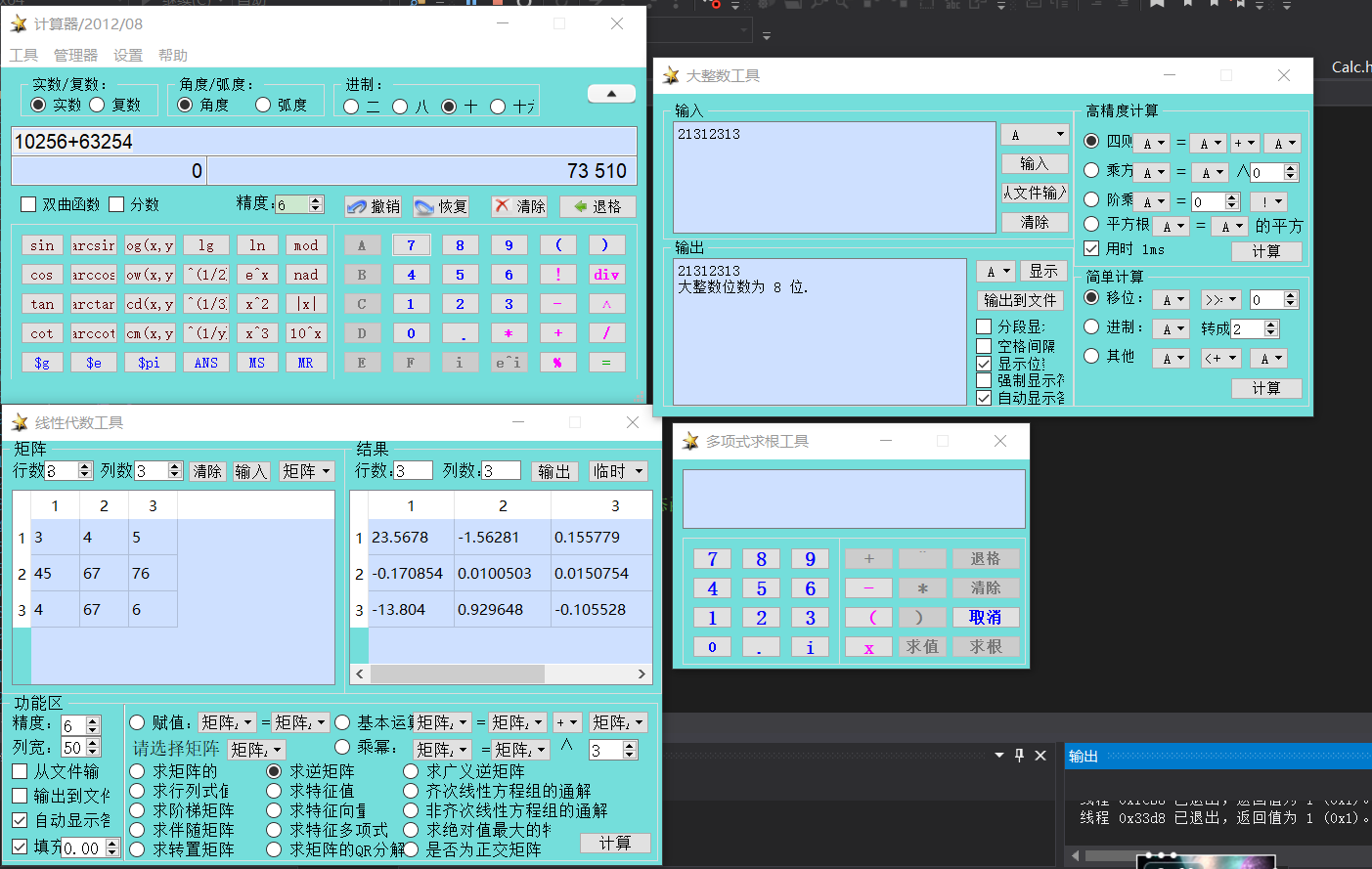 此计算器包含基本的加减乘除运算之外,还包含有大整数计算工具,线代计算工具,多项式求解等计算工具,可以在工具下拉菜单里进行选择: