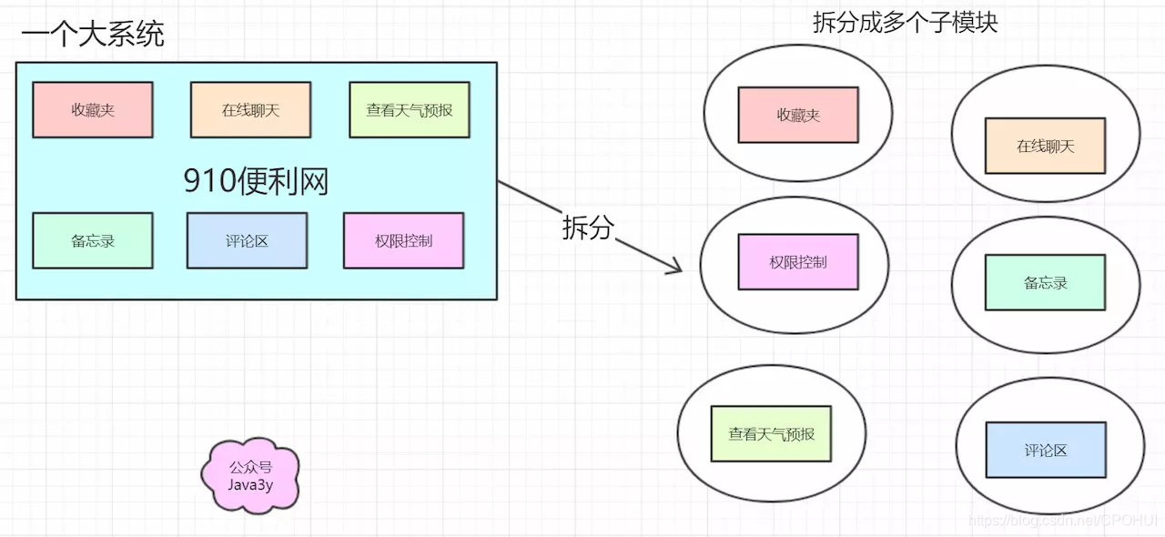 前面也讲了,从分布式/微服务的角度而言:就是把我们一大的项目,分解成多个小的模块。这些小的模块组合起来,完成功能。