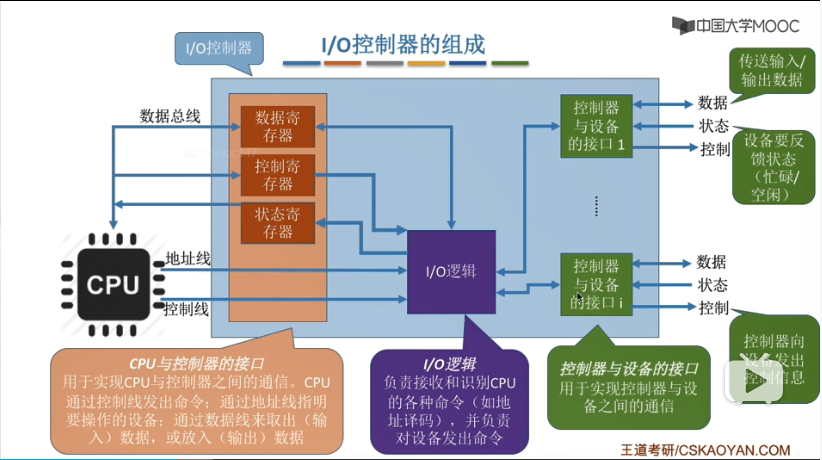 控制器与设备的接口:输出命令的话,它只需要输出数据,同时返回设备状态。如果是输入命令的话,将数据以及设备状态通过IO逻辑转移到寄存器中,CPU从寄存器读入。