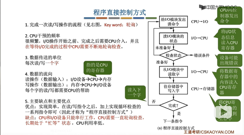 程序直接控制方式: 假如是读指令,CPU发出指令后,要一直等待IO完成后将状态寄存器改变,以通知CPU可以进行读操作,读到CPU寄存器中,再到内存中去。CPU需要一直轮询等待慢速的IO