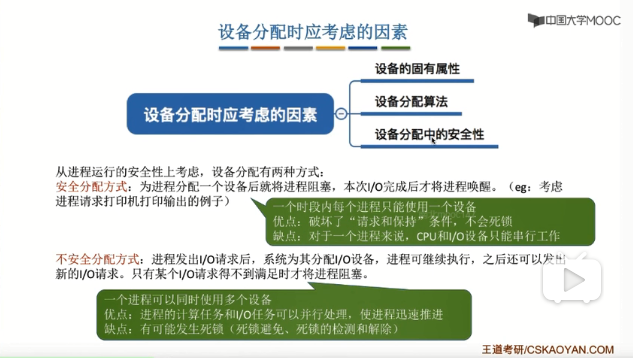 不安全分配:发出IO请求后,进程不需要等待IO结束,而是接着执行,可以再申请IO设备。可以使用银行家算法来避免不安全状态(分配IO设备资源之前计算分配掉的话会不会造成银行家问题的破产)