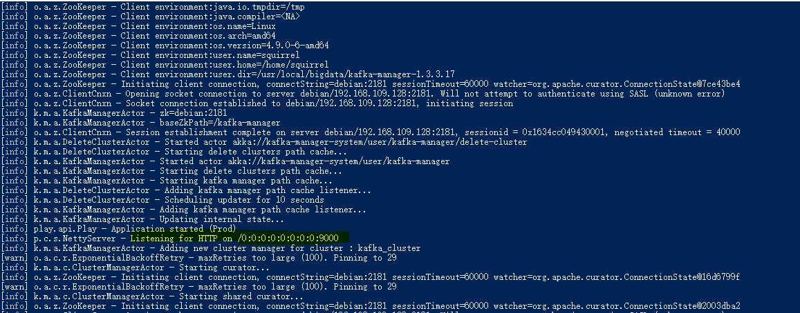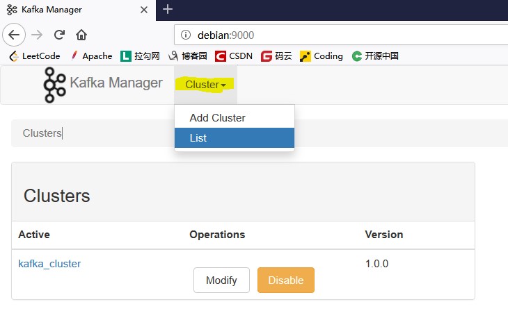 - 访问kafka-manager: debian:9000(默认端口,可配置)