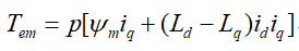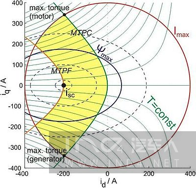 凸极式(内埋式)永磁同步电机,由于转矩方程中非线性部分(磁阻转矩)的存在,因而采取最大转矩电流比(MTPA)的方法进行控制能够最大程度发挥电机及逆变器的效能,控制方法相对来说会复杂一些。