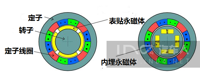 有了以上两点,再来看图一就不难理解了,左边那张图是表贴式的永磁同步电机,因为永磁体的磁导率跟空气基本一样,那么无论在直轴还是在交轴,其磁路闭合路径上的磁导都是一样的,Ld=Lq,所以是一个隐极电机。而右边那张图,在d轴方向,永磁体占掉了铁芯的空间,铁材料的含量比Q轴要少,从而Ld<Lq,是一个凸极电机。