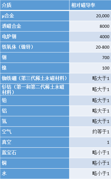 这个概念理清楚以后,我们在来看另外一个概念,就是磁导率,磁导率反应的是一个材料的导磁性能,通过下表可见,其实大量使用的稀土永磁材料,虽然有很大的磁能积和矫顽力,其磁导率与空气比较接近而不是与铁磁材料接近。