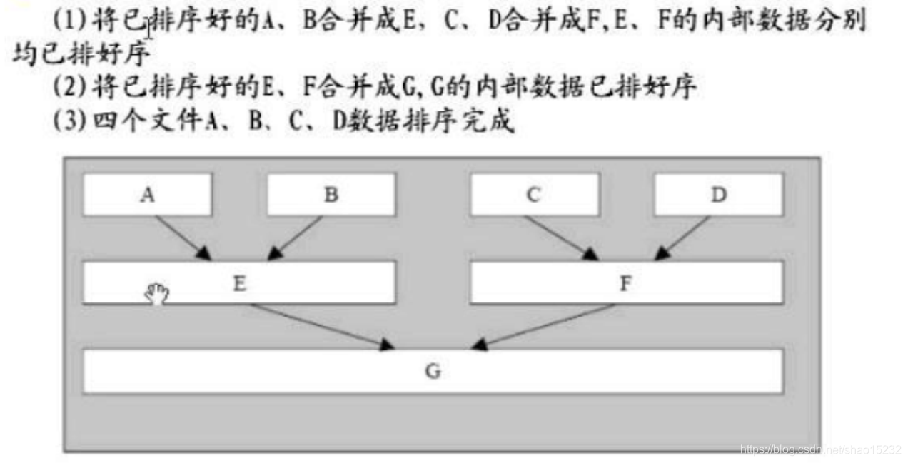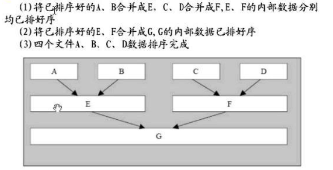 再对所有已排序好的文件两两合并, 直到所有文件合并成一个文件后,