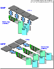 和 NUMA 不同, MPP 提供了另外一种进行系统扩展的方式,它由多个 SMP 服务器通过一定的节点互联网络进行连接,协同工作,完成相同的任务,从用户的角度来看是一个服务器系统。其基本特征是由多个 SMP 服务器 ( 每个 SMP 服务器称节点 ) 通过节点互联网络连接而成,每个节点只访问自己的本地资源 ( 内存、存储等 ) ,是一种完全无共享 (Share Nothing) 结构,因而扩展能力最好,理论上其扩展无限制,目前的技术可实现 512 个节点互联,数千个 CPU 。目前业界对节点互联网络暂无标准,如 NCR 的 Bynet , IBM 的 SPSwitch ,它们都采用了不同的内部实现机制。但节点互联网仅供 MPP 服务器内部使用,对用户而言是透明的。