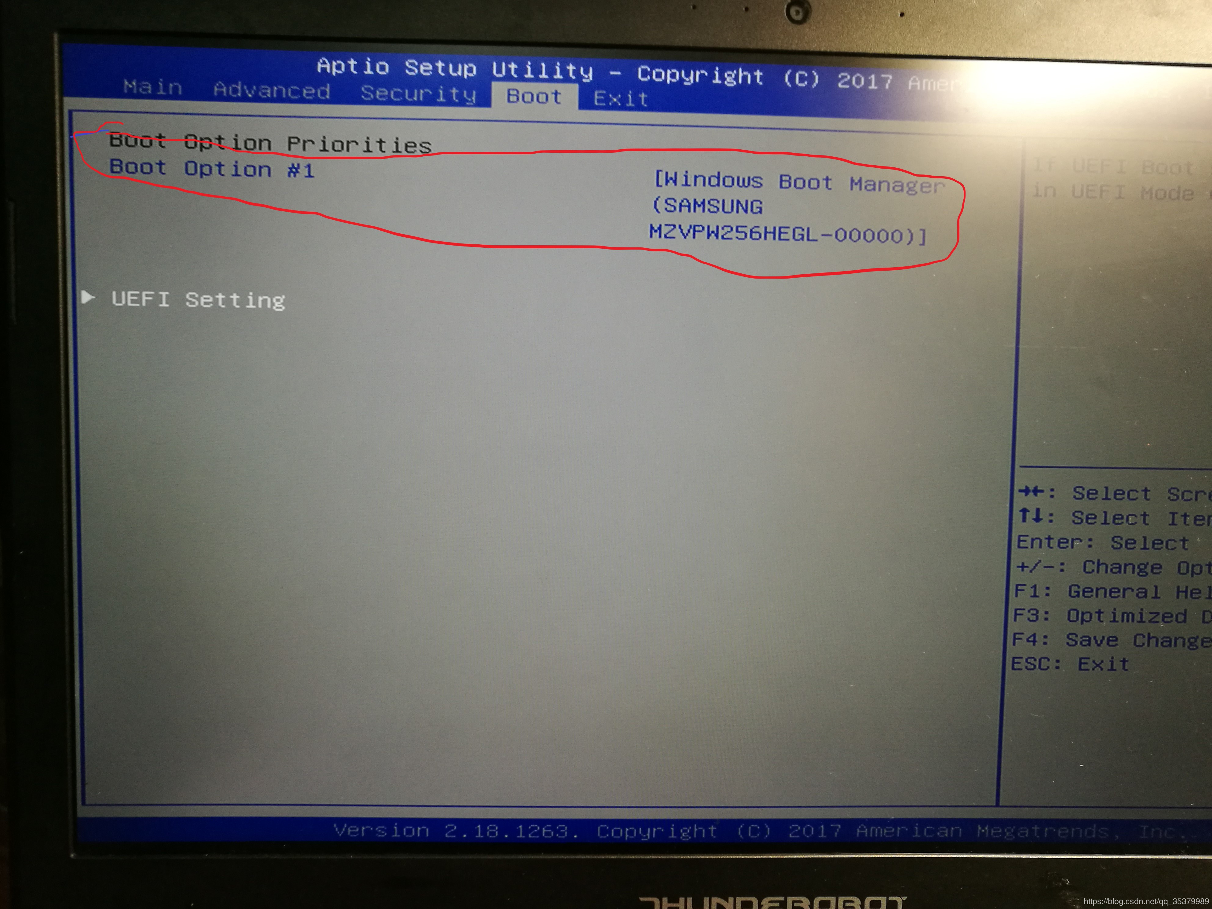 (3)设置U盘优先启动(这里我是安装后拍的图没插U盘所以选择后还是显示Windows优先启动),如图设置,注意这里到Boot下是对boot option按回车,然后选择你的U盘名字,一般是UEFI 开头再加上U盘品牌的英文名称