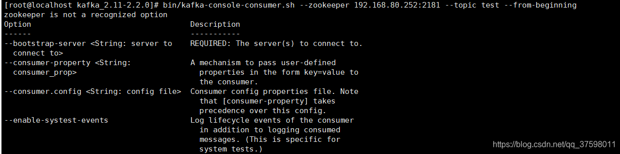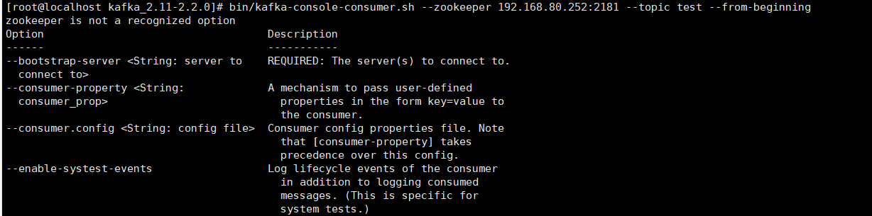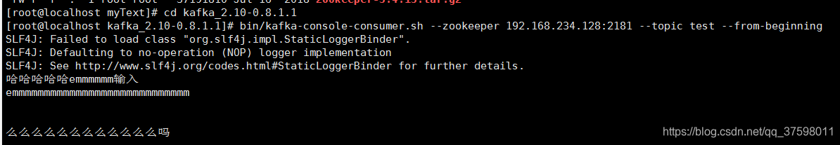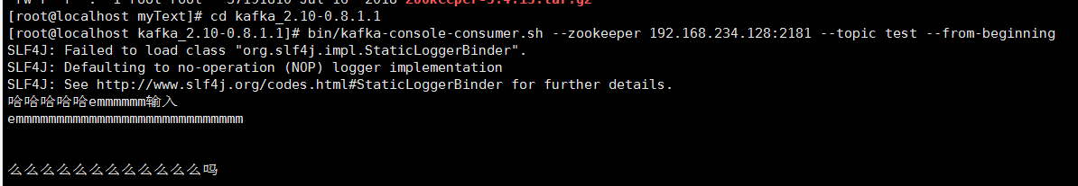bin/kafka-console-consumer.sh --zookeeper 192.168.234.128:2181 --topic test --from-beginning