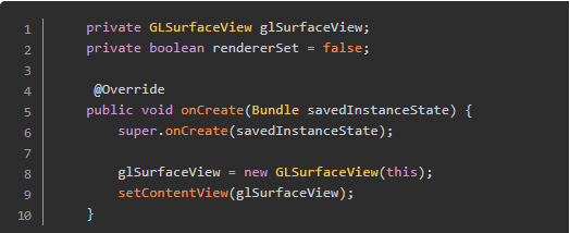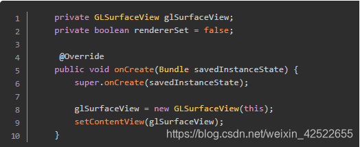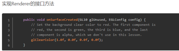 4)通过setRenderer()来传入一个自定义的Renderer类,当surfaceview创建或者发生改变以及绘制新一帧的时候,渲染器都会被GLSurfaceView调用