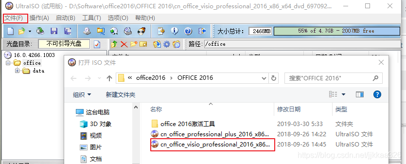 3.准备一个4G以上的U盘并插入USB电脑接口;打开ultraiso软件,在菜单栏【文件】-【打开】,选择第1步下载的ISO文件。如下图所示(更新图片时,没有ubuntu的ISO文件在手边,用了office的ISO做了个示例)