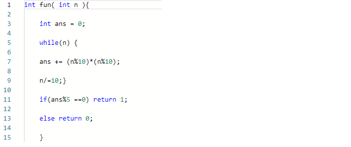 题目内容描述:编写函数fun,其功能是:判断一个整数的各位数字平方之和能否被5整除,可以被5整除则返回1,否则返回0。