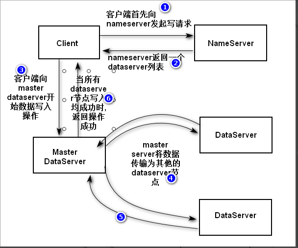 master server将数据传输为其他的dataserver节点,只有当所有dataserver节点写入均成功时,master server才会向nameserver和客户端返回操作成功的信息。