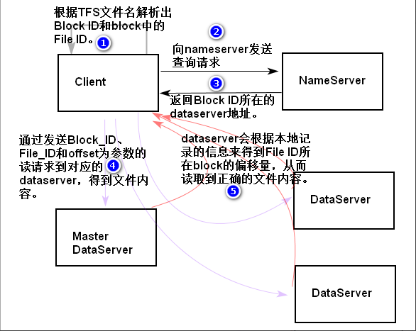 通过发送Block_ID、File_ID和offset为参数的读请求到对应的dataserver,得到文件内容。