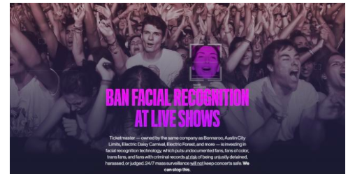 此前,由于在一些音乐节上出现的人脸识别技术,让未注册、有色人种、跨性别、有犯罪记录的粉丝遭受了特别待遇,这些粉丝被不公正的拘留和骚扰,甚至被误判,因而引起了一场音乐人联署运动,要求禁止在音乐节等现场表演活动中使用人脸识别。
