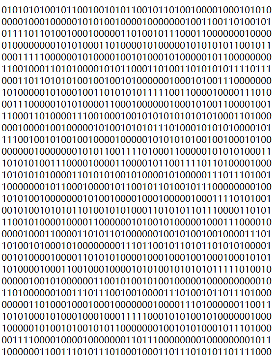 01010101001011001001010110010110100100001000101010 00001000100000101010010000100000001001100110100101 01111011010010001000001101001011100011000000010000 01000000001010100011010000101000001010101011001011 00011111000000101000010010100010100000101100000000 11001000110101000010101100011010011010101011110111 00011011010101001001001010000001000101001110000000 10100000101000100110101010111110011000010000111010 00111000001010100001100010000001000101001100001001 11000110100001110010001001010101010101010001101000 00010000100100000101001010101110100010101010000101 11100100101001001000010000010101010100100100010100 00000010000000101011001111010001100000101010100011 10101010011100001000011000010110011110110100001000 10101010100001101010100101000010100000111011101001 10000000101100010000101100101101001011100000000100 10101001000000010100100001000100000100011110101001 00101001010101101001010100011010101101110000110101 11001010000100001100000010100101000001000111000010 00001000110000110101101000000100101001001000011101 10100101000101000000001110110010110101101010100001 00101000010000110101010000100010001001000100010101 10100001000110010001000010101001010101011111010010 00000100101000000110010100101001000001000000000010 11010000001001110111001001000011101001011011101000 00000110100010001000100000001000011101000000110011 10101000101000100010001111100010101001010000001000 10000010100101001010110000000100101010001011101000 00111100001000010000000110111000000001000000001011 10000001100111010111010001000110111010101101111000
