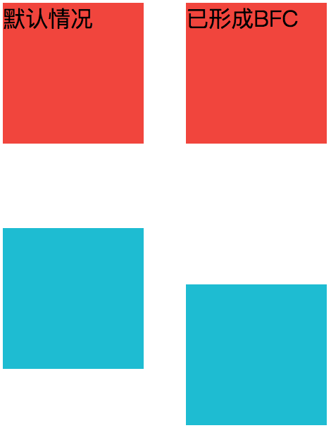 但是我们给第一个盒子添加display: inline-block;样式后,就形成了BFC,然后根据BFC容器是一个独立的区域,内部元素和外部元素互不影响这一特性,这时两盒子的距离为100px。