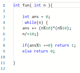 题目内容:判断一个整数的各位数字平方之和能否被5整除,可以被5整除则返回1,否则返回0。