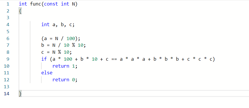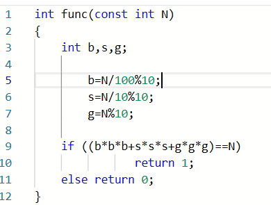 题目内容:本题要求实现一个函数,判断任一整数是否为水仙花数(必须是三位数,且数的每一位上数字的立方和与数本身相等)。
