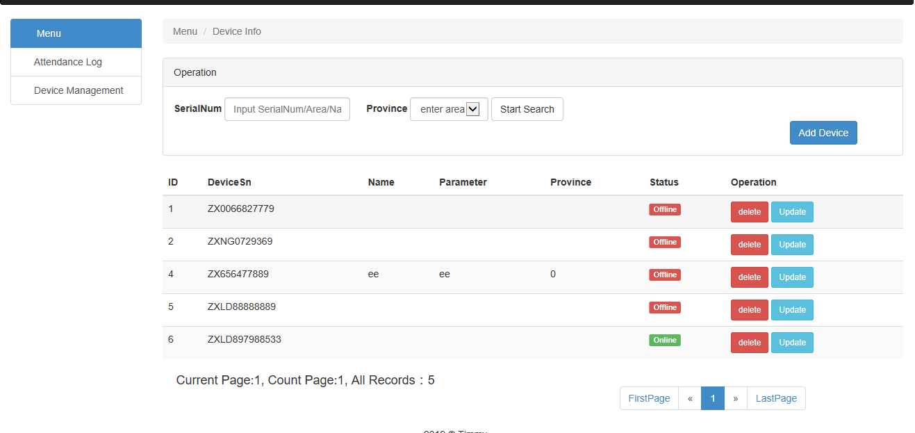 (1)大体界面如下,主要包括了关键词搜索,分页查询功能,设备的增删改查