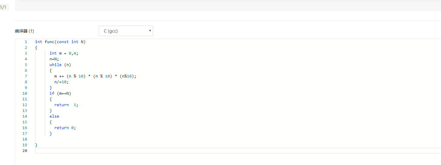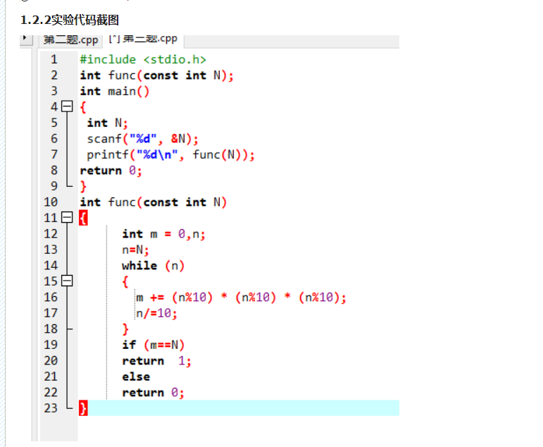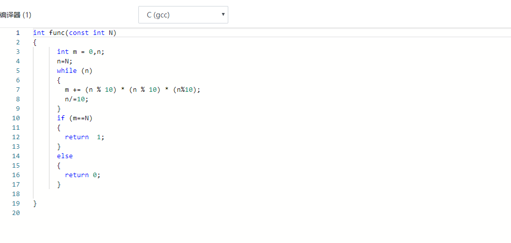 数据处理:运用到了 func 函数,while循环语句,if-else语句,表达式有 m += (n % 10) * (n % 10) * (n%10); n/=10;