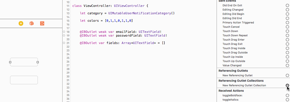 @IBOutlet weak var emailField: UITextField!, passwordField: UITextField!